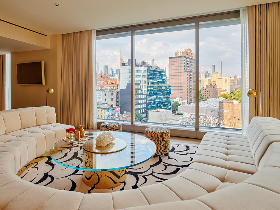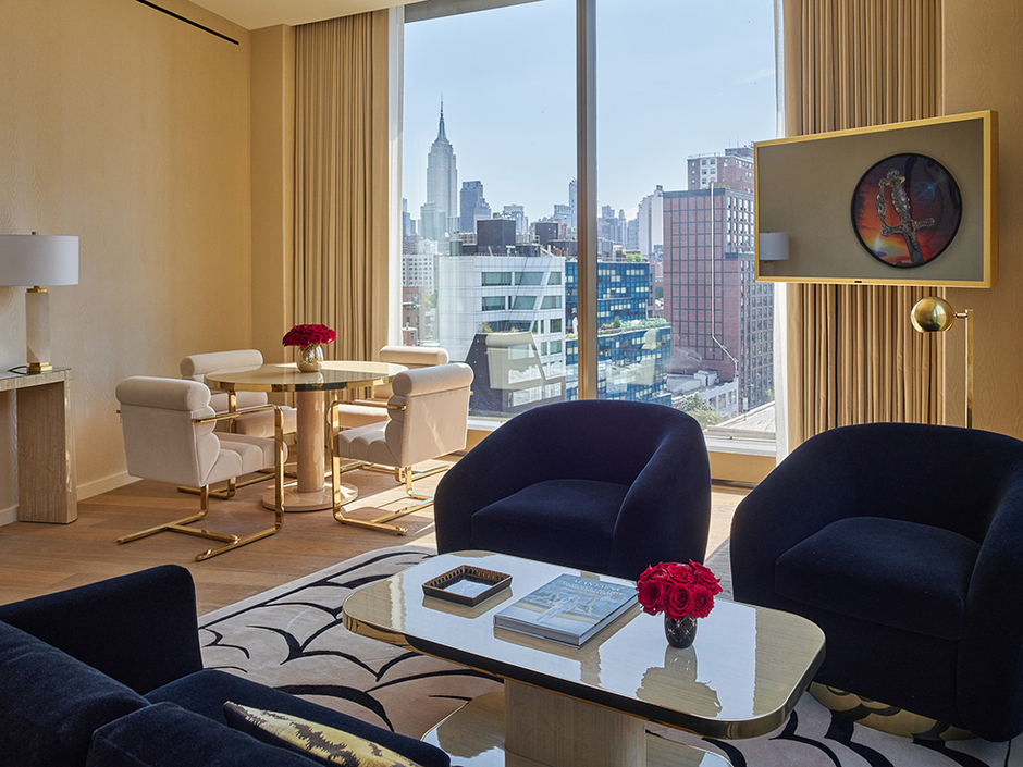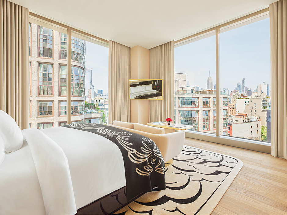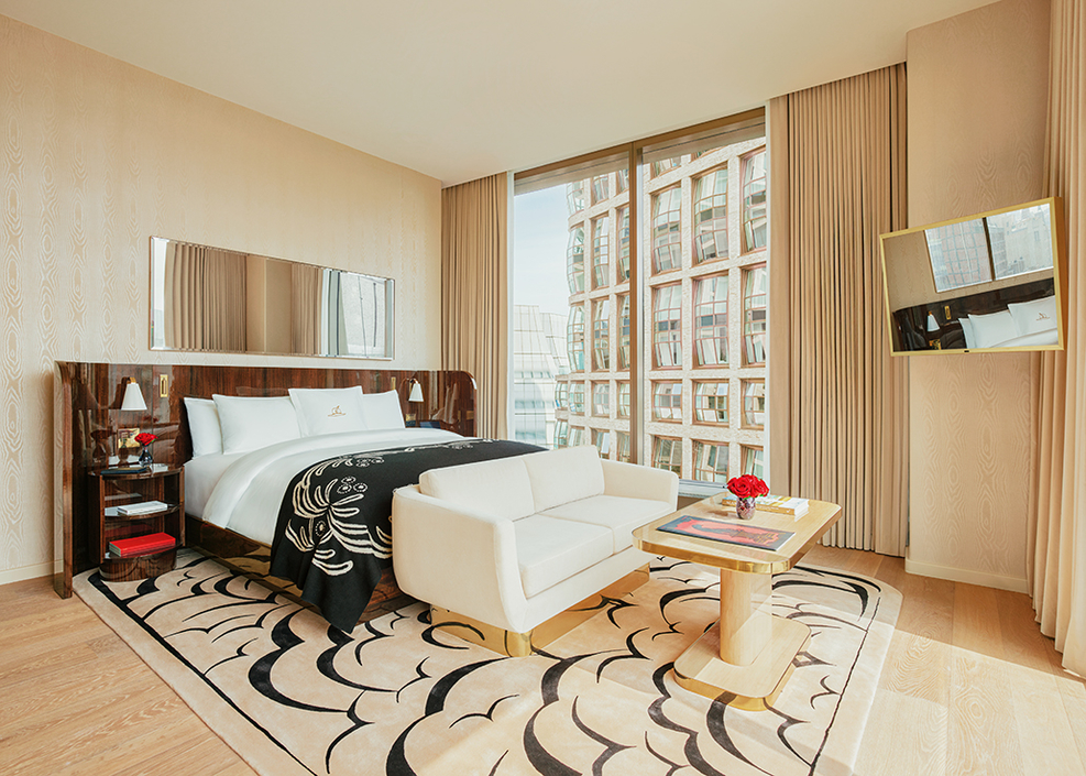 Diseñado por Bjarke Ingels Group, con interiores del Faena Design Team y Peter Mikic, el hotel ocupa diez pisos y cuenta con 120 habitaciones y suites bellamente decoradas, con ventanales de suelo a techo que ofrecen vistas panorámicas del río Hudson y del skyline de Nueva York. La espectacular Faena Suite de dos pisos incluye tres dormitorios con cama king, una terraza ajardinada y un piano de cola pequeño, ofreciendo una experiencia de penthouse inolvidable.