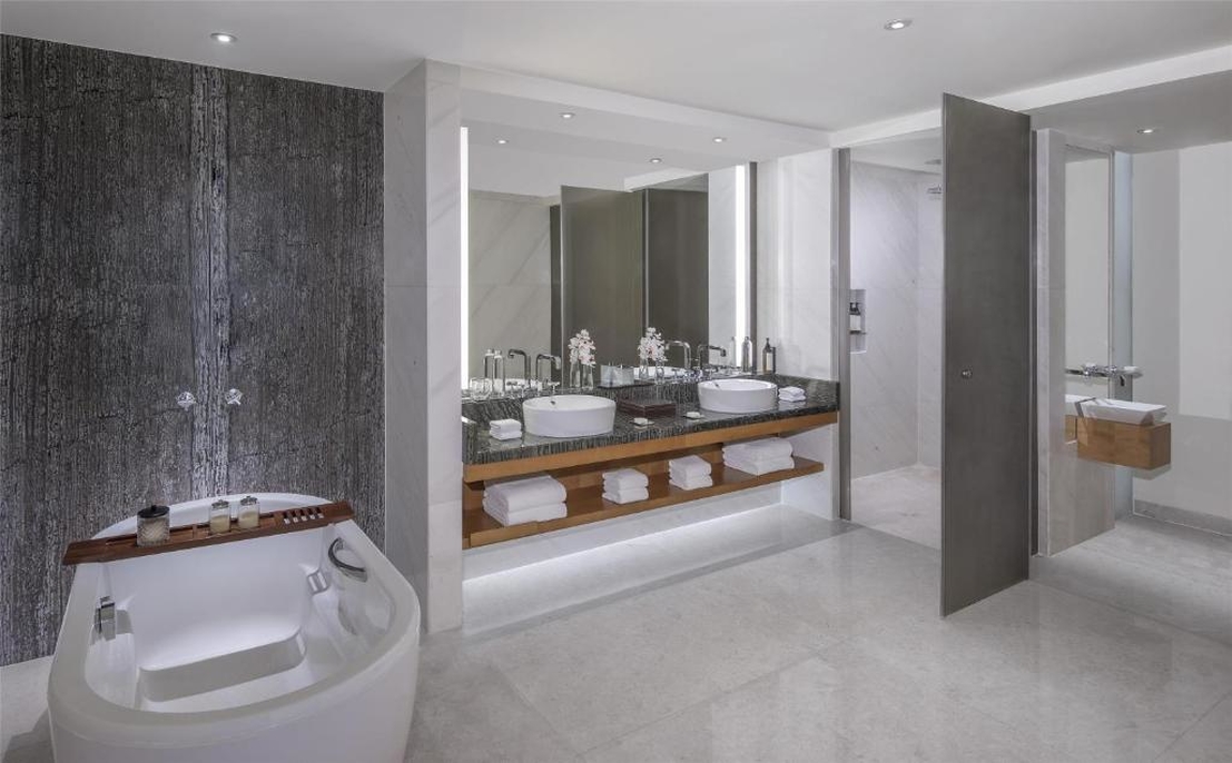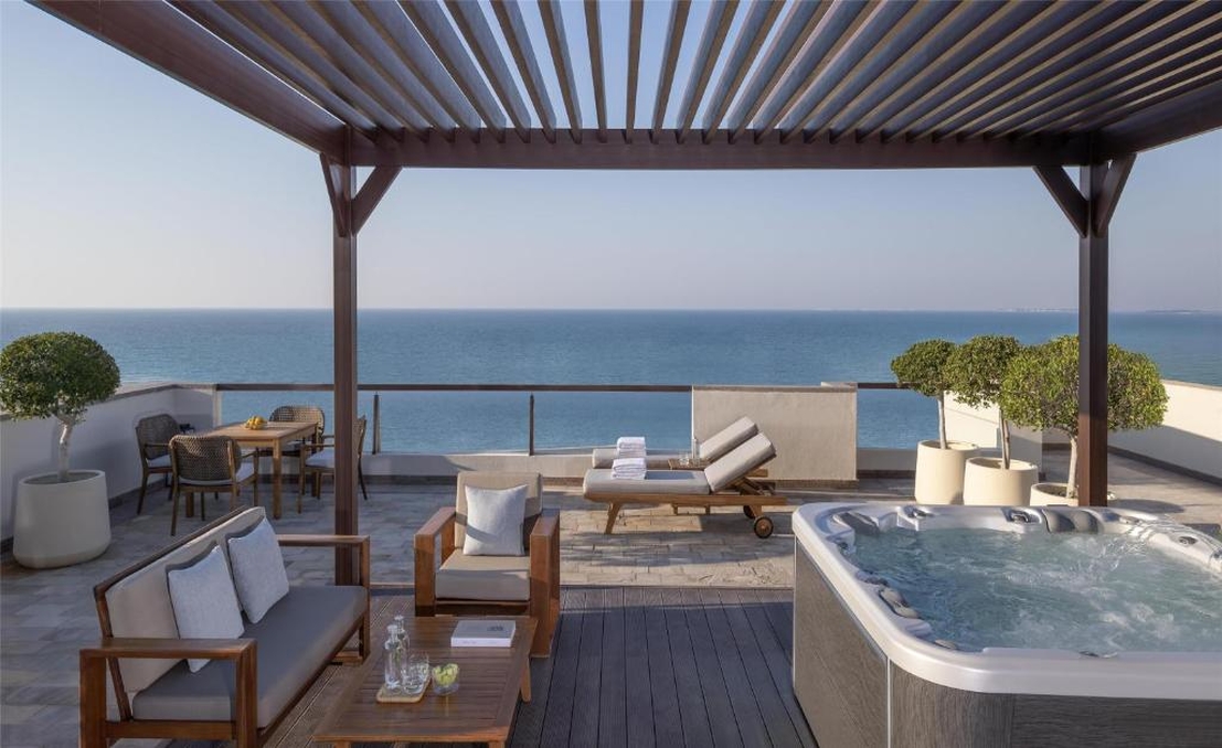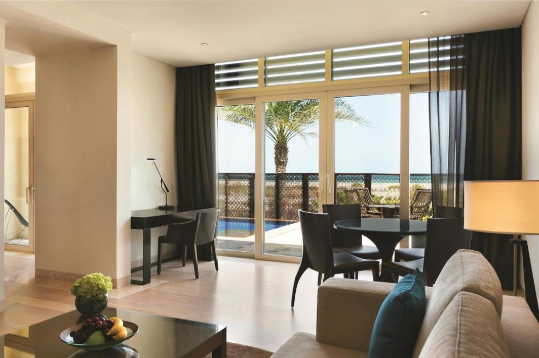 Le complexe propose 306 chambres, suites et villas spacieuses, toutes conçues avec soin pour allier confort et sophistication. Les baies vitrées offrent des vues spectaculaires sur le golfe Persique ou sur les jardins luxuriants, tandis que les balcons et terrasses privés permettent aux hôtes de profiter pleinement de ce cadre paisible. Les intérieurs, aux tons neutres, matériaux naturels et finitions raffinées, créent une atmosphère de luxe discret et élégant.
