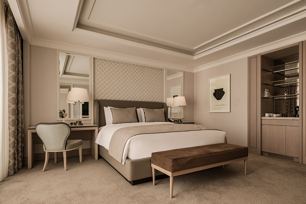 Step into a world of regal living at Giza Palace, where guest-rooms embody the perfect blend of comfort and sophistication. 560 Guest-Rooms & Suites ranging from 53 to 319 m2, each room offers ample space for relaxation and rejuvenation in style. Guests can expect spacious, light-filled interiors, premium Egyptian linens, and luxurious bathrooms that combine sophistication with comfort.